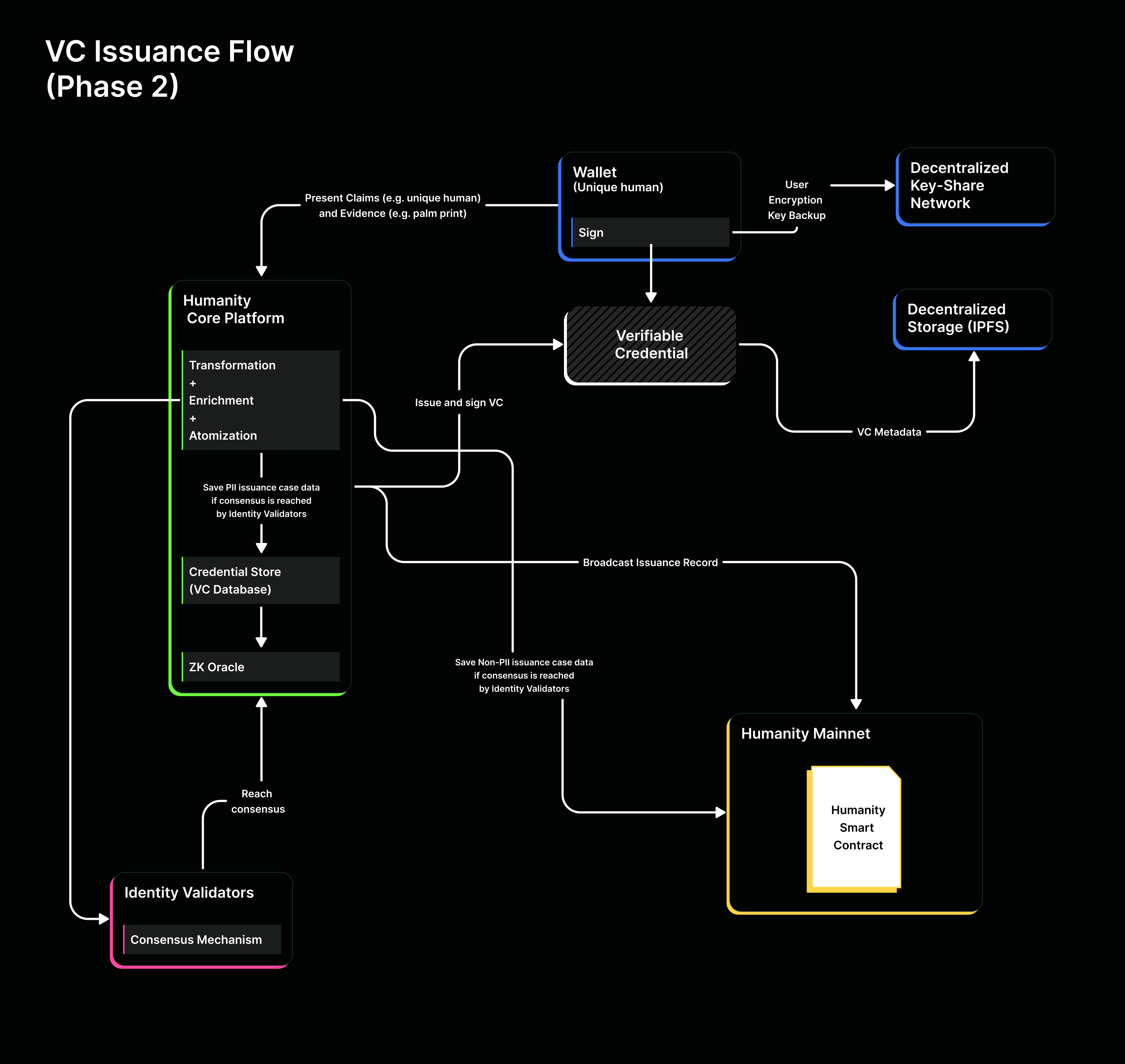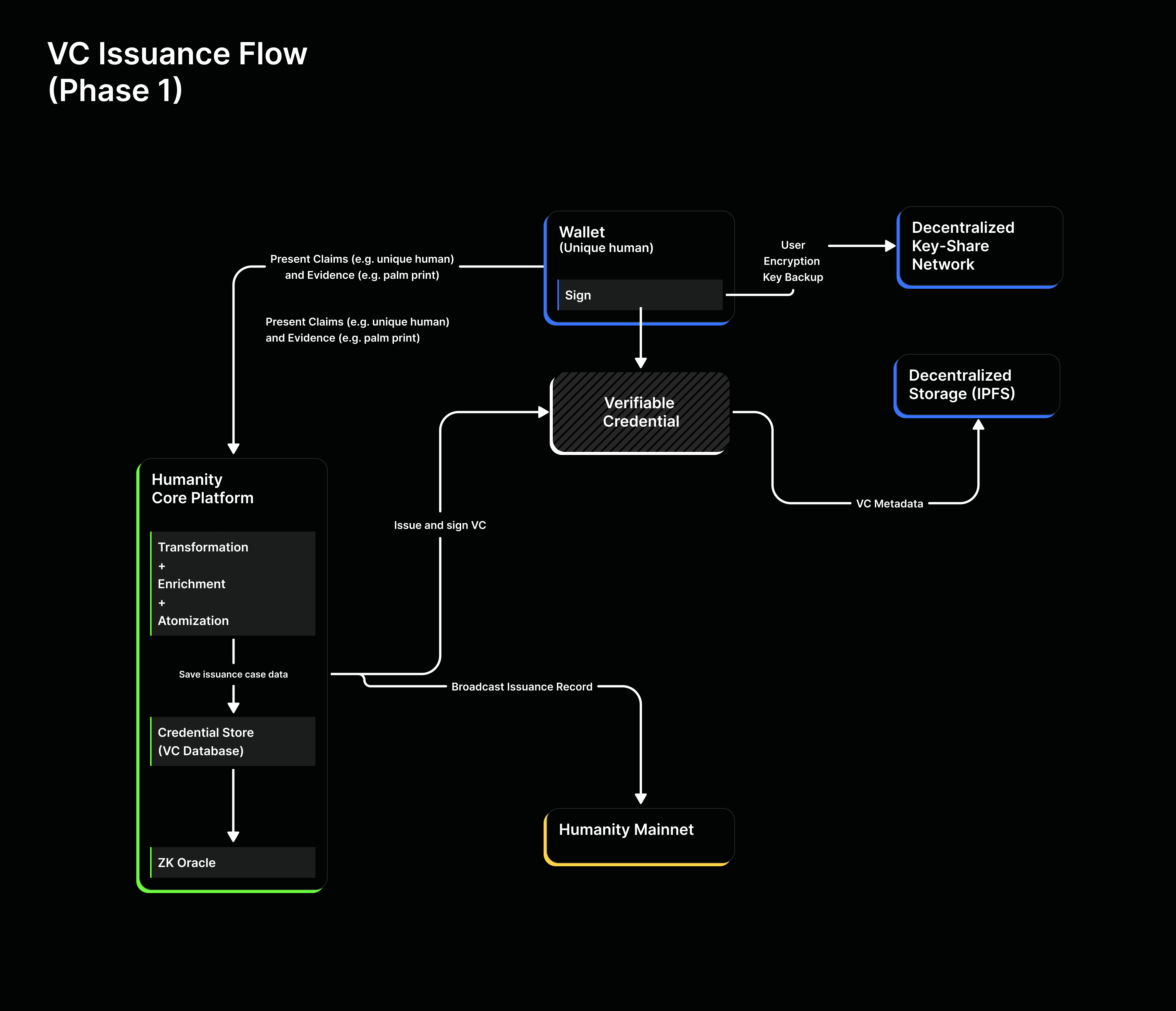 | Interoperability   | Humanity is built on the open standards of DID and VC and developed with interoperability in mind. User VCs will be portable to other applications on L2, L3, — even the physical world.                                                  |