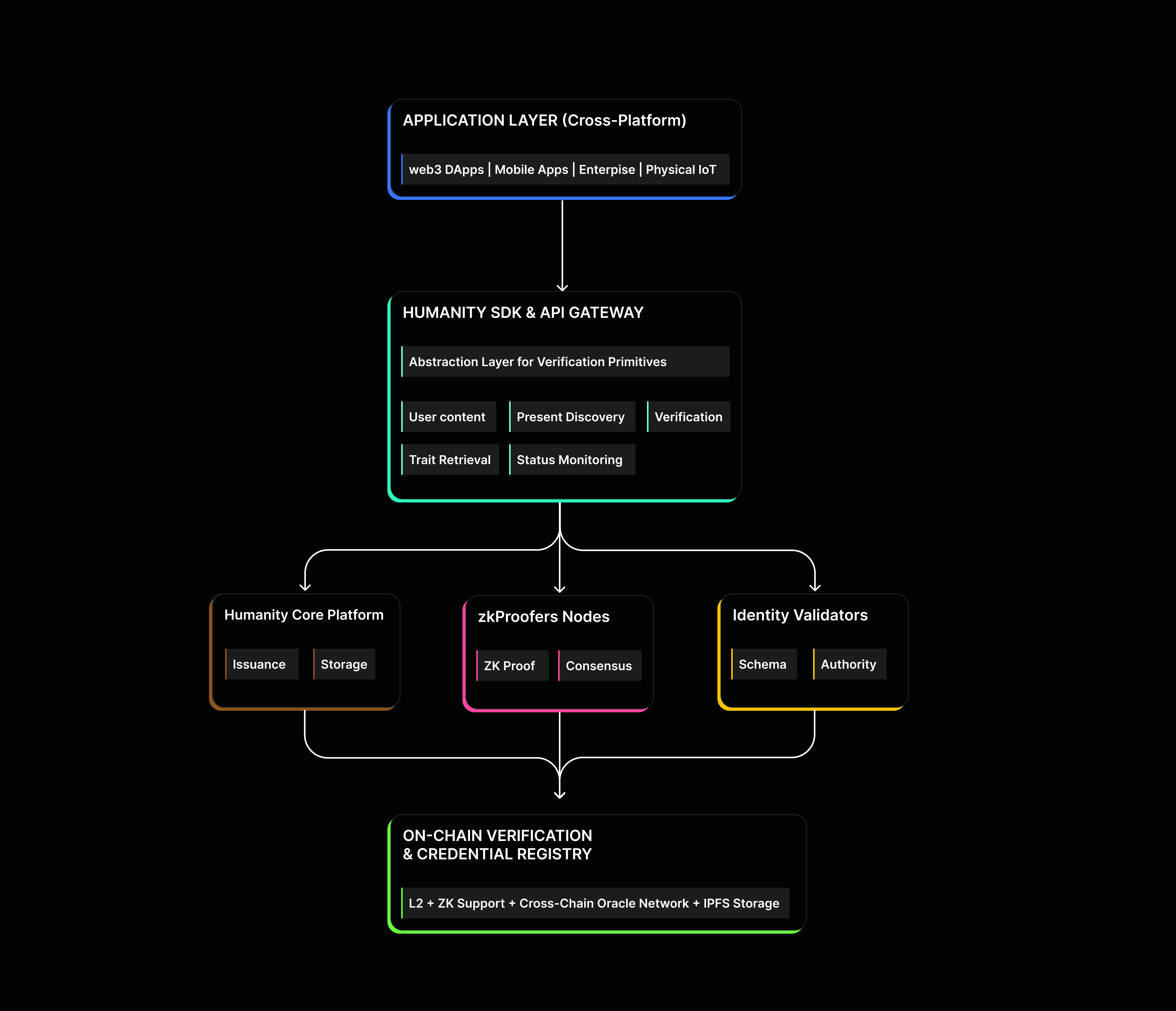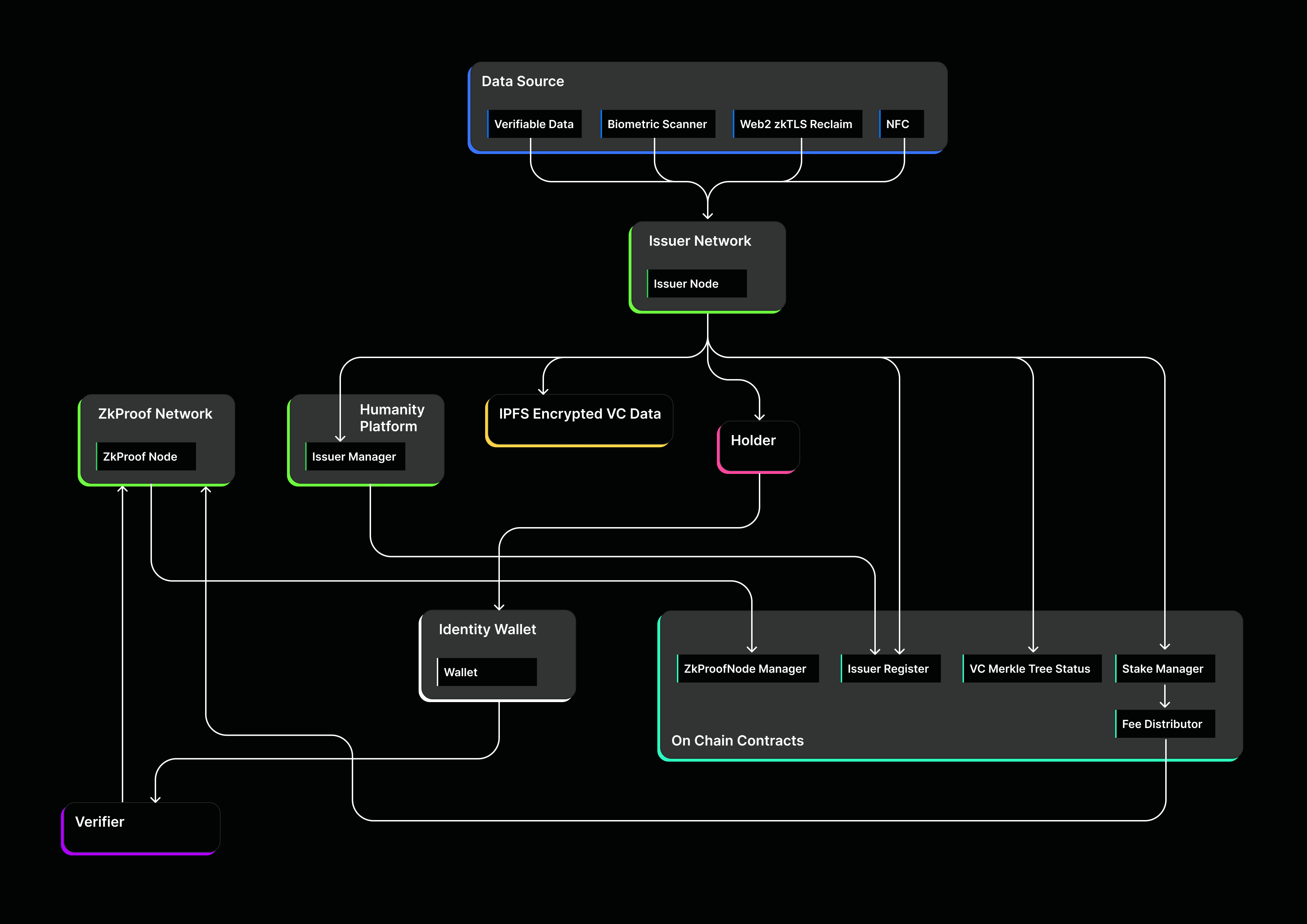 This architecture enables developers to implement verifiable authentication of any personal data while maintaining user privacy and autonomy. Users retain full control and ownership over their identity data, while the network guarantees the verifiability, uniqueness, and authenticity of each participant through decentralized consensus.