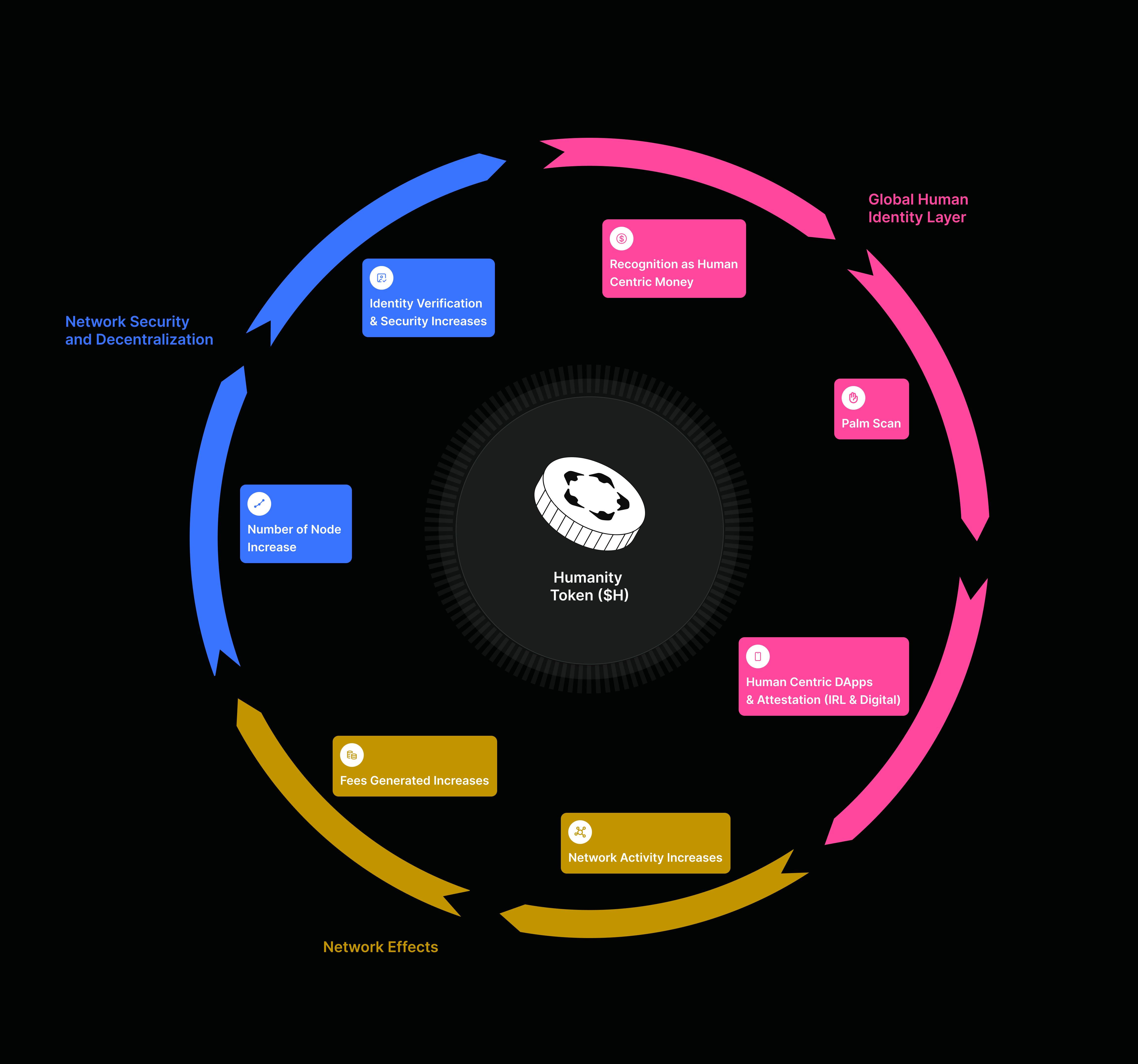 * **Humanity Foundation**: Expends $H tokens on a variety of fronts including identification rewards, grants to ecosystem partners, operational costs, marketing initiatives, and community activations. Its revenue streams comprise collecting gas fees and conducting token buybacks, strategies aimed at regulating the token's market supply and preserving its value. These activities cyclically support the ecosystem's expansion and viability.